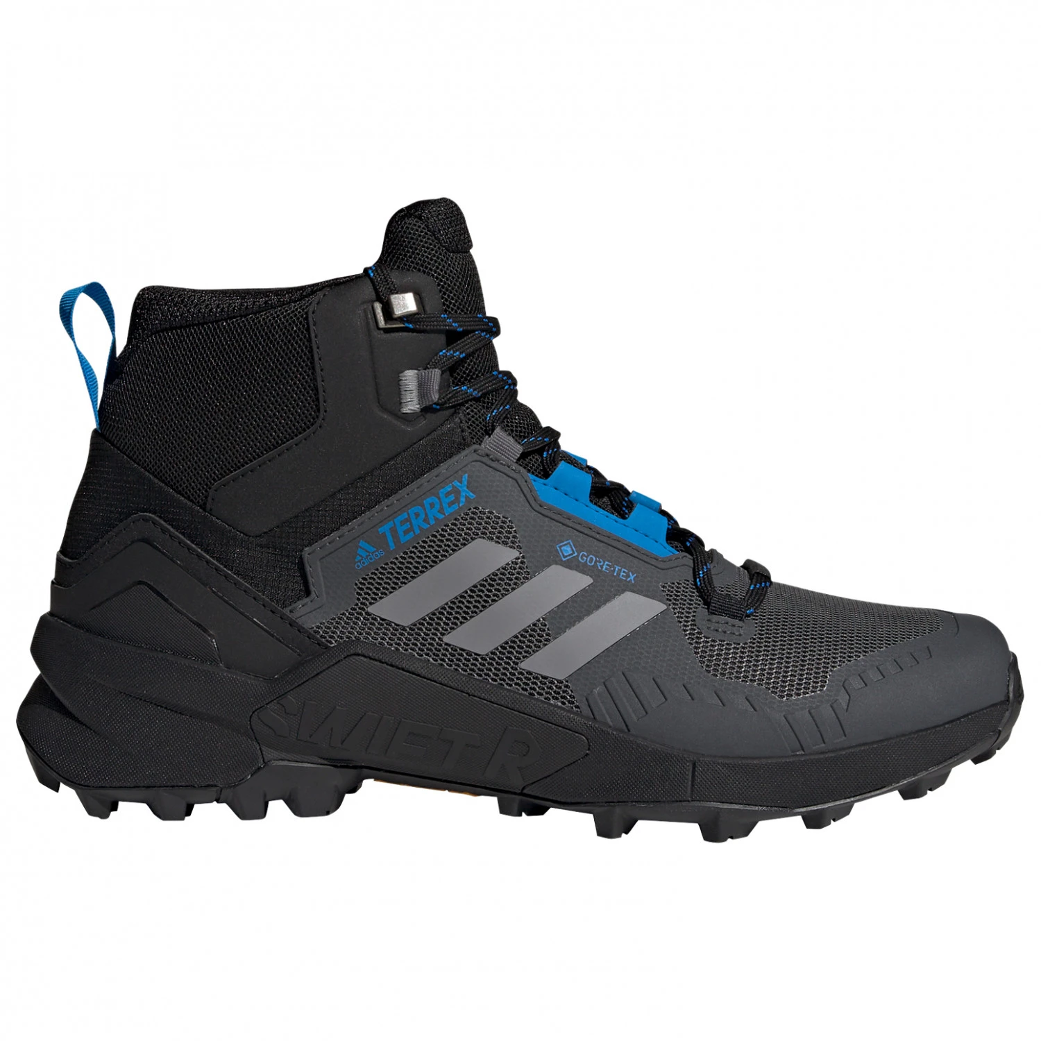 La semelle extérieure Continental adhère sur toute surface glissante, car elle est particulièrement antidérapante. Le pare-pierres intégré protège le dessous des chaussures Terrex Swift R3 Mid GTX contre les cailloux tranchants et prolonge leur durée de vie. Le renfort au niveau du talon stabilise le pied pendant la marche. La languette sur le talon est pratique pour se chausser facilement ! La semelle intercalaire en EVA est légère et offre un amorti agréable, notamment sur les surfaces accidentées et difficiles.